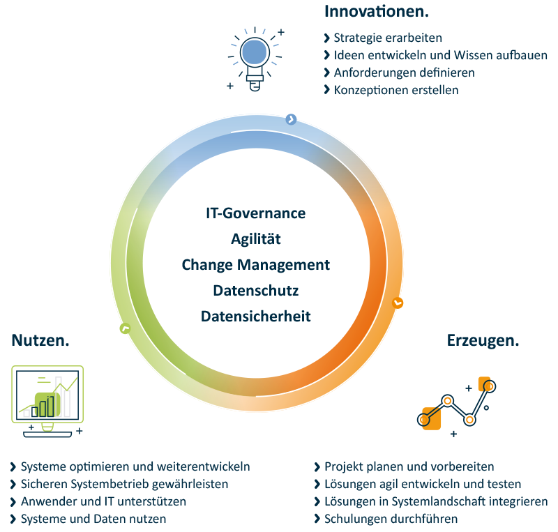 Wir stellen somit eine schnelle und effiziente Projektdurchführung sicher. Unsere Nähe zu den betroffenen Fachbereichen und der erforderlichen Expertise gewährleistet, dass das angestrebte Ergebnis erzielt wird – sowohl aus Sicht des Business als auch aus der Perspektive des IT-Bereiches.
